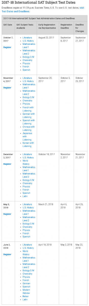 The charts on the left display all of the SAT and SAT Subject test dates for the 2017-18 school year. Students can see more information about these tests and can register by clicking here.
