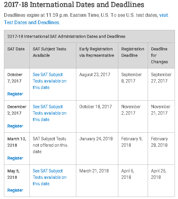 The charts on the left display all of the SAT and SAT Subject test dates for the 2017-18 school year. Students can see more information about these tests and can register by clicking here.